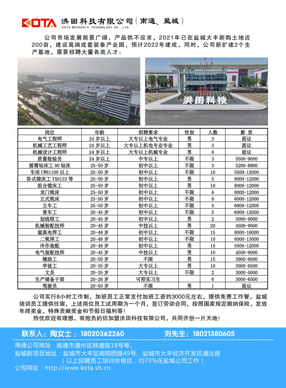 Selskapet har bredt markedsutviklingsutsikter og produktene er mangelvare. I 2021 har den kjøpt nesten 200 dekar land i Dafeng, Yancheng for å bygge en high-end komplett utstyrsindustripark, som forventes å være ferdig i 2022. Samtidig har selskapet utvidet to nye produksjonsbaser og må rekruttere et stort antall talenter av forskjellige typer: