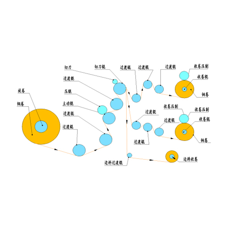Arbeidsprinsippet for spaltemaskinen er å spalte den store rullen av kobberfolie i den nødvendige størrelsen og bredden gjennom en serie operasjoner. Arbeidstrinnene er som følger: